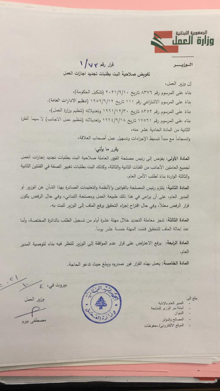 تسوية اوضاع العمال الاجانب المخالفين لشروط العمل والاقامة في لبنان